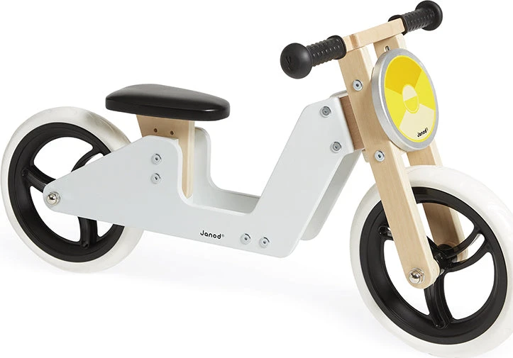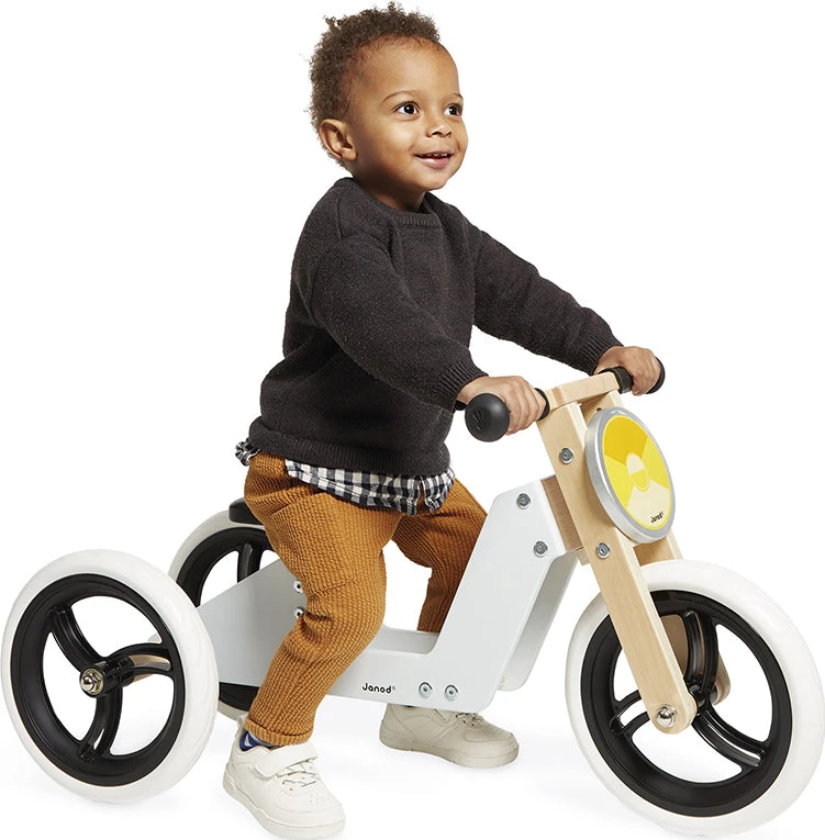 By tricycle or balance bike, let’s go for great rides indoors and outdoors! Lovely wooden tricycle that turns into a balance bike. In the tricycle version your child will develop his gross motor skills and in the balance bike version, he will learn to balance. Your child will also appreciate its soft seat, adjustable in height (28 cm to 34 cm) (11 in. to 13.4 in.), and its silicone handles, soft for little hands. Early-years toy made using FSCTM wood for children from 18 months. Sturdy on its 3 wheels, Janods’ tricycle has been designed to accompany your child in his quest for freedom and wide open spaces! It quickly turns into a balance bike with its solid tires resistant to punctures, and its adjustable saddle! Ready for adventure!