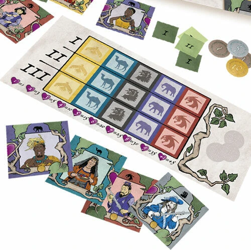During each of three rounds, every player begins with a hand of 6 Ancestor tiles. They then go around and around, choosing one and then passing their remaining tiles to the next player. The chosen ancestors are added to the family trees, connected by leaves or hearts. Once 5 Ancestor tiles have been added to the tree, the round ends. Players compare their family tree to those of their neighbors and gain points for the longest connected generations and for coin icons in their tree. After three rounds, players gain bonus points for all the marriages they have created. The player with the highest score wins!