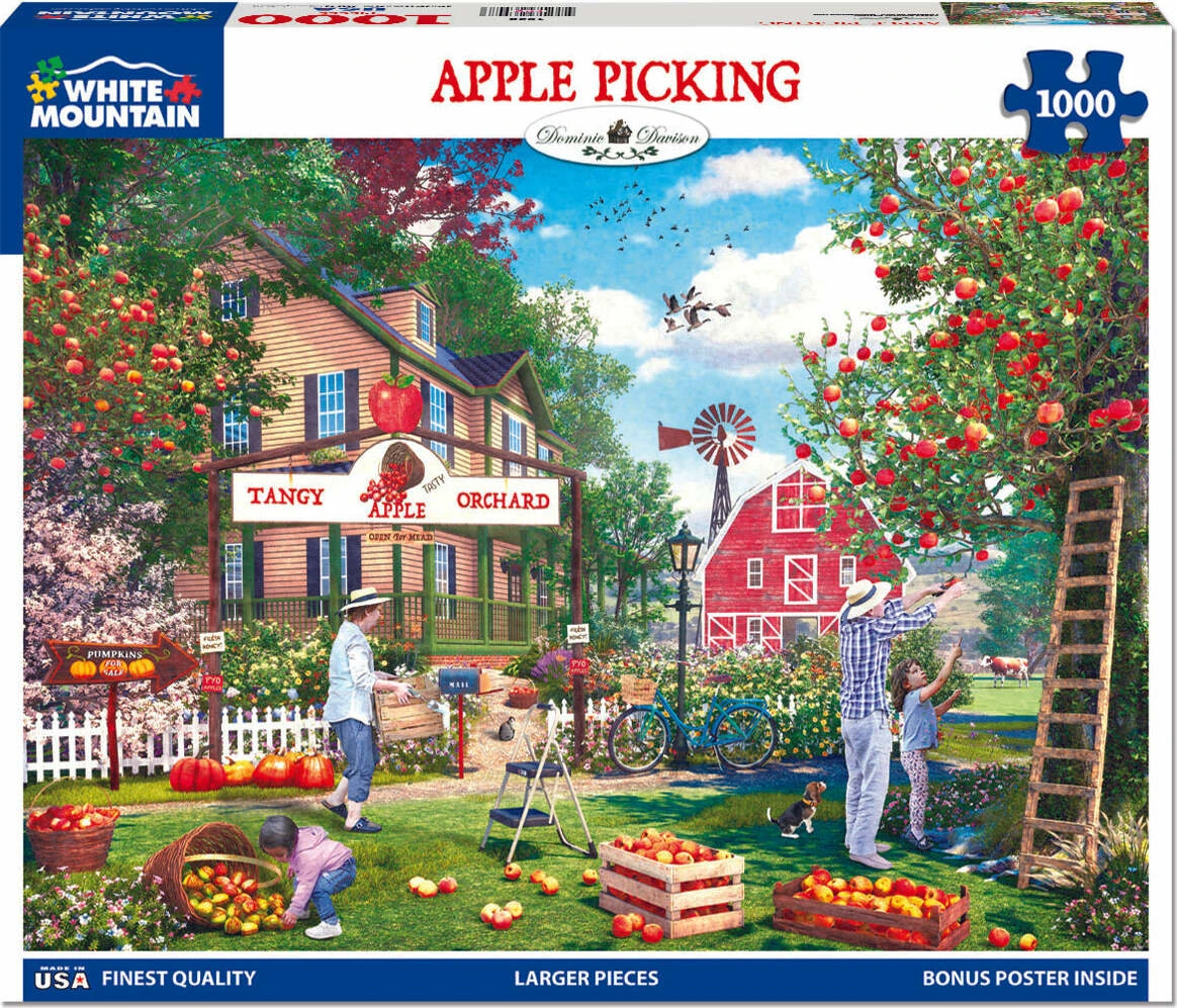 1832pz Apple Picking. Apple pie, apple crisp, caramel apples, and more. Visit the Tangy Apple Orchard for all your apple needs. Spend a few hours wandering through the trees and create family memories while picking apples yourself or pick up a hand-picked bushel courtesy of the residents with added assistance of the family dog. Artist Dominic Davidson brings back memories of apple picking with the kids while conjuring the smell of baking apples in your mind and growls from your tummy in this 1000 piece jigsaw puzzle. Finished size 24″ x 30″.
