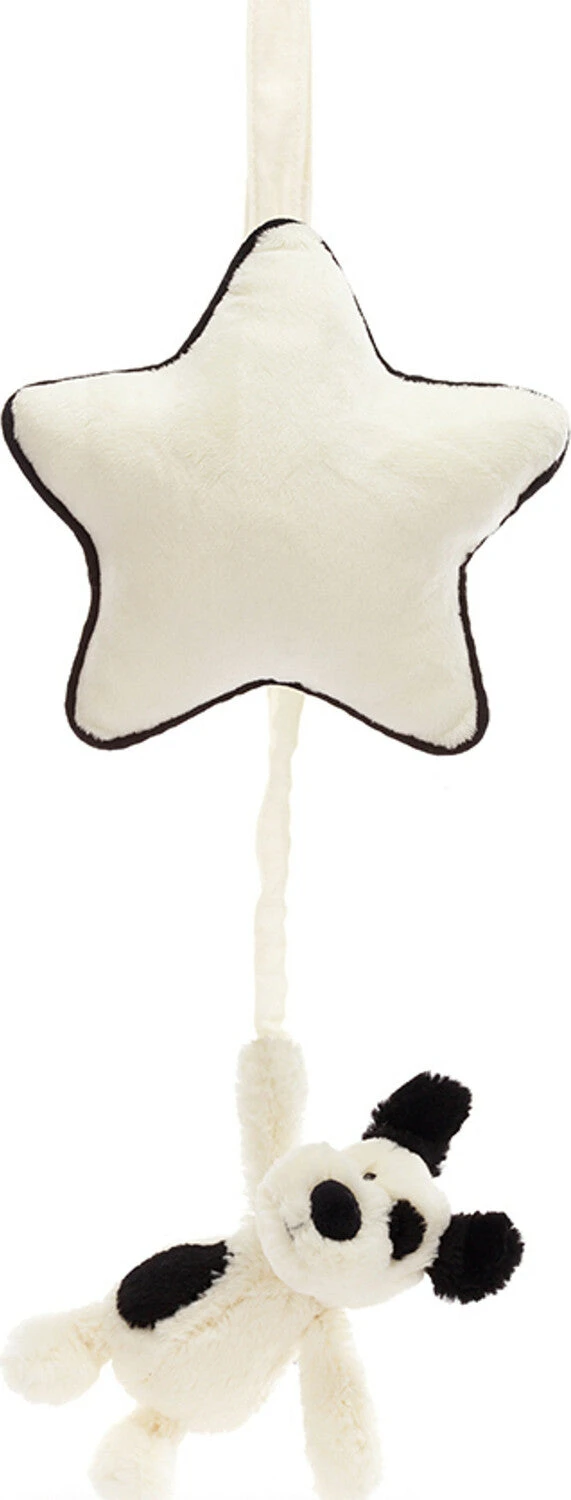The Bashful Black & Cream Puppy Musical Pull is a soothing gift to help babies drift off. Jellycat’s most loved black-and-white pup has gorgeous cream fur with licorice-colored patches made with recycled fibers and holds on tight to a concertina pull. Gently pull Puppy and an original Jellycat lullaby will play from the stylishly monochrome trimmed star.
