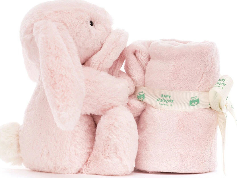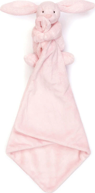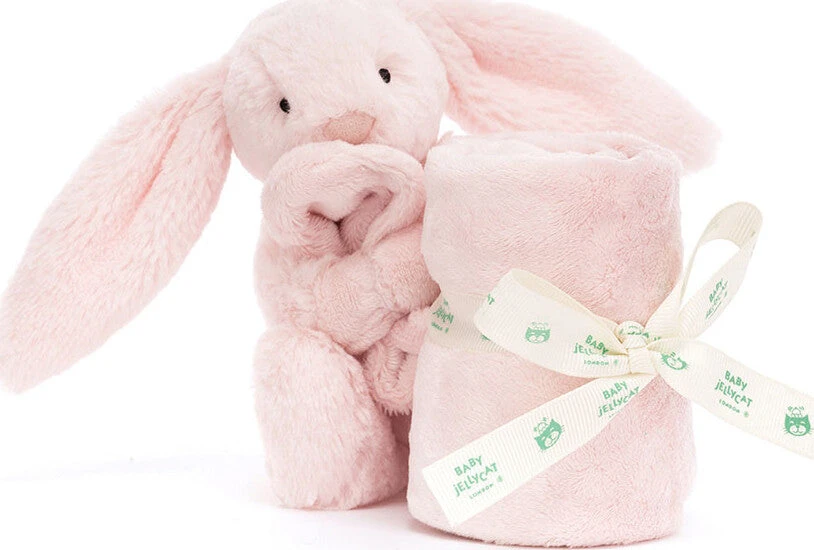 A perfect gift for newborns, the Bashful Bunny Soother is Jellycat’s most loved Bashful Bunny in a soft fur, with long lopped ears, a pink suedette nose and stitched eye detail holding a square shaped soother, un-stuffed and irresistibly soft to touch. Made from recycled fibers and neatly rolled up and presented with a Baby Jellycat grosgrain ribbon.
