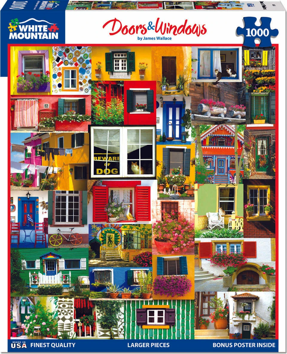1735 Doors & Windows. Travel the world without leaving your house with this puzzle featuring a collage of colorful doors and windows. Artist James Wallace included cats in some of their favorite spots. Can you find them? 1,000 piece puzzle with a finished size of 24″ x 30″.