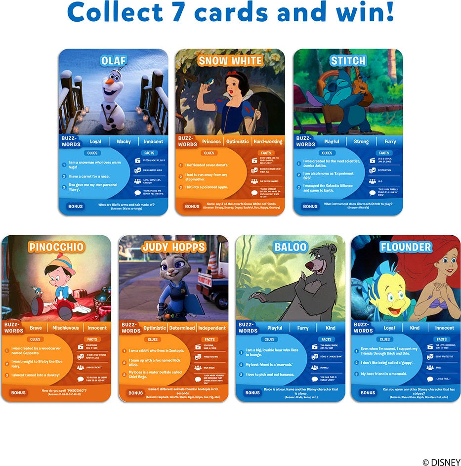 - Ask smart yes or no questions to guess the Disney character on the card. Can this character fly? Does this character wear a blue gown? The first player to guess 7 cards wins the game!