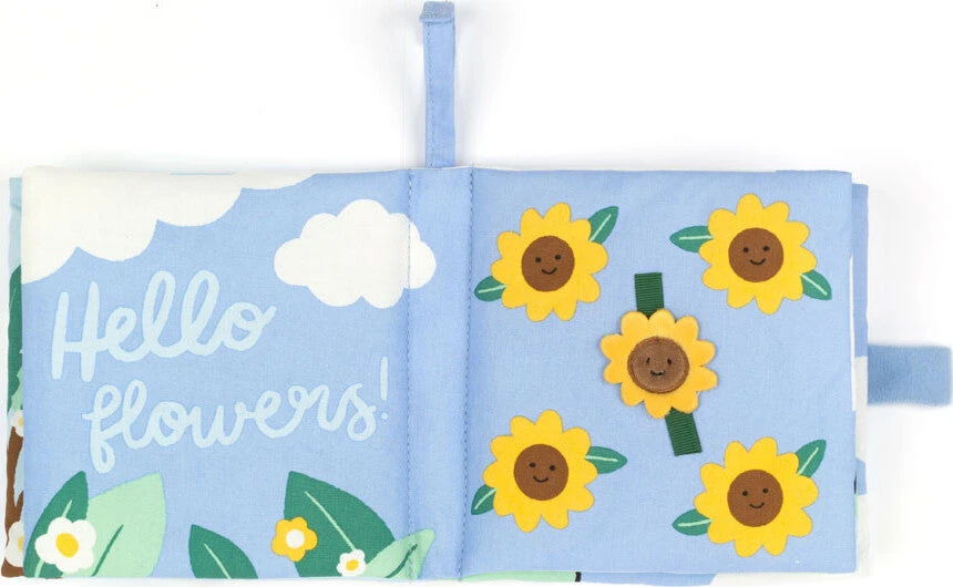 The Hello Sun Fabric Book is a joyfully interactive story for young babies. Featuring bright illustrations, crinkle pages, applique textures and a mirror to delight and entertain. Easily attachable to buggies or cribs with a Velcro fastening, this is a warming first book for curious babies.