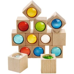 These blocks have built in kaleidoscopic screens make your block sets irresistibly mesmerizing. This is just what every set needs to make your structures new and exciting. Children ages 1 and up can experiment with color by looking through different colored blocks in side by side comparisons. Blocks can be combined to try to find new colors in the spectrum. These blocks also make a perfect compliment to any HABA building system.
