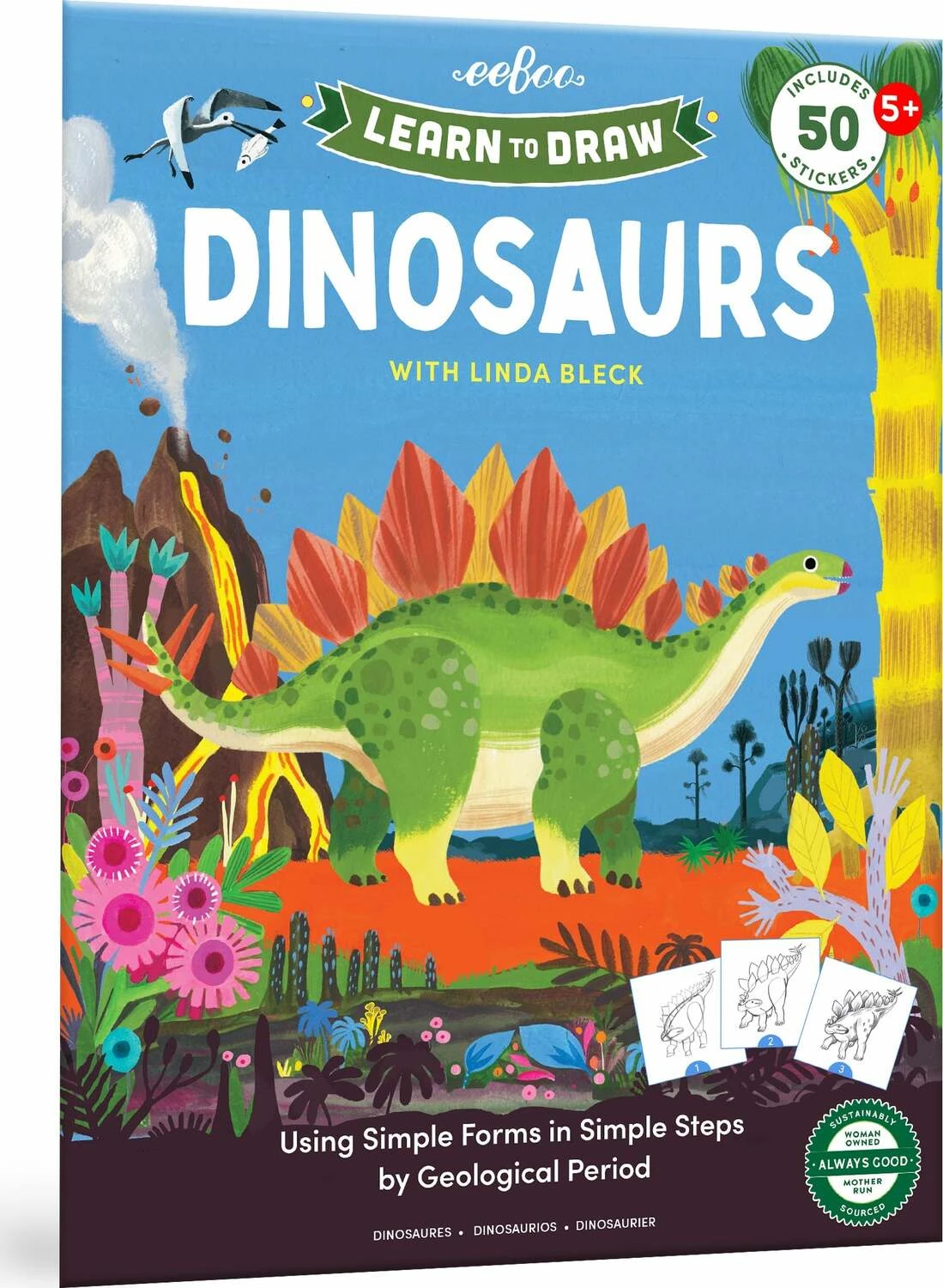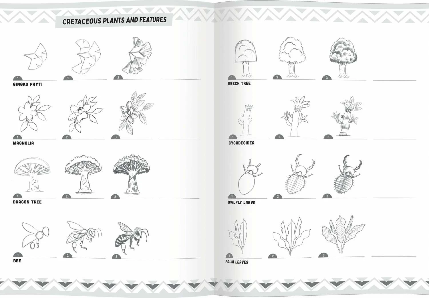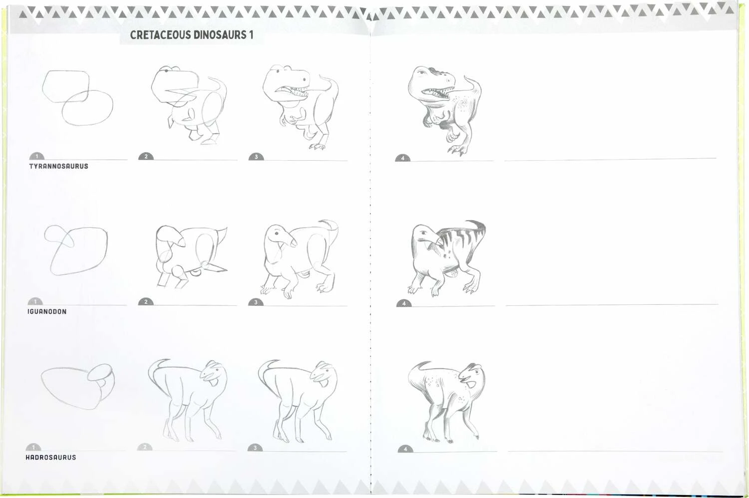 A thoughtfully designed introduction to drawing dinosaurs in sequential steps. Sections are organized by geological period, each ending with a two-page landscape spread for you to populate with the creatures and prehistoric plants you have learned to draw!