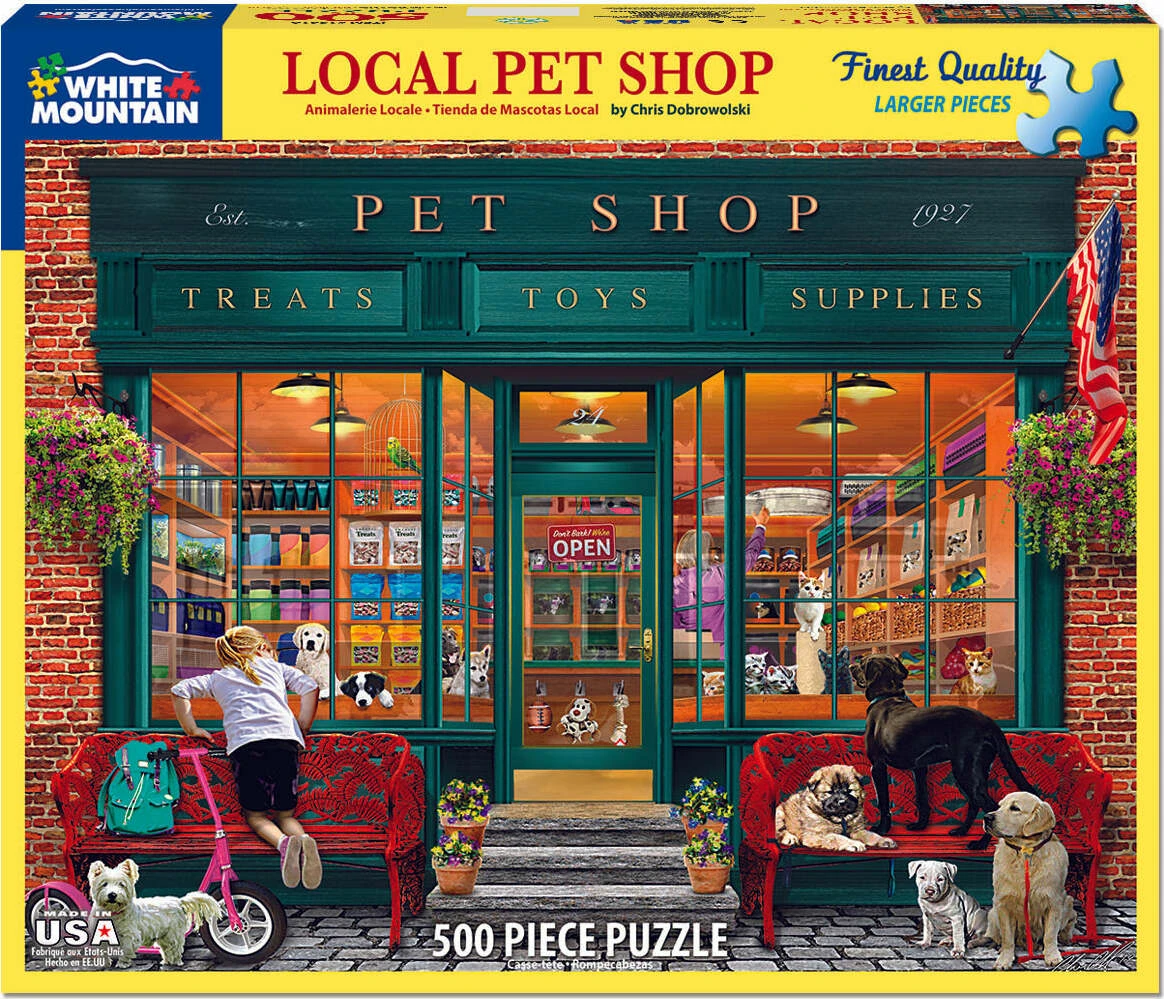 Treats, toys, and supplies have been bringing animal lovers to this delightful shop since 1927. Inviting wrought iron benches outside provide viewing platforms for a young girl and her canine friends, enchanted by the view through the large windows, Inside, more pups and cats return their gaze while the owner arranges food and wares on the shelves. This 500 piece puzzle has a finished size of 18″ x 24″.