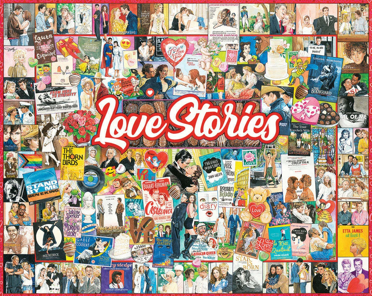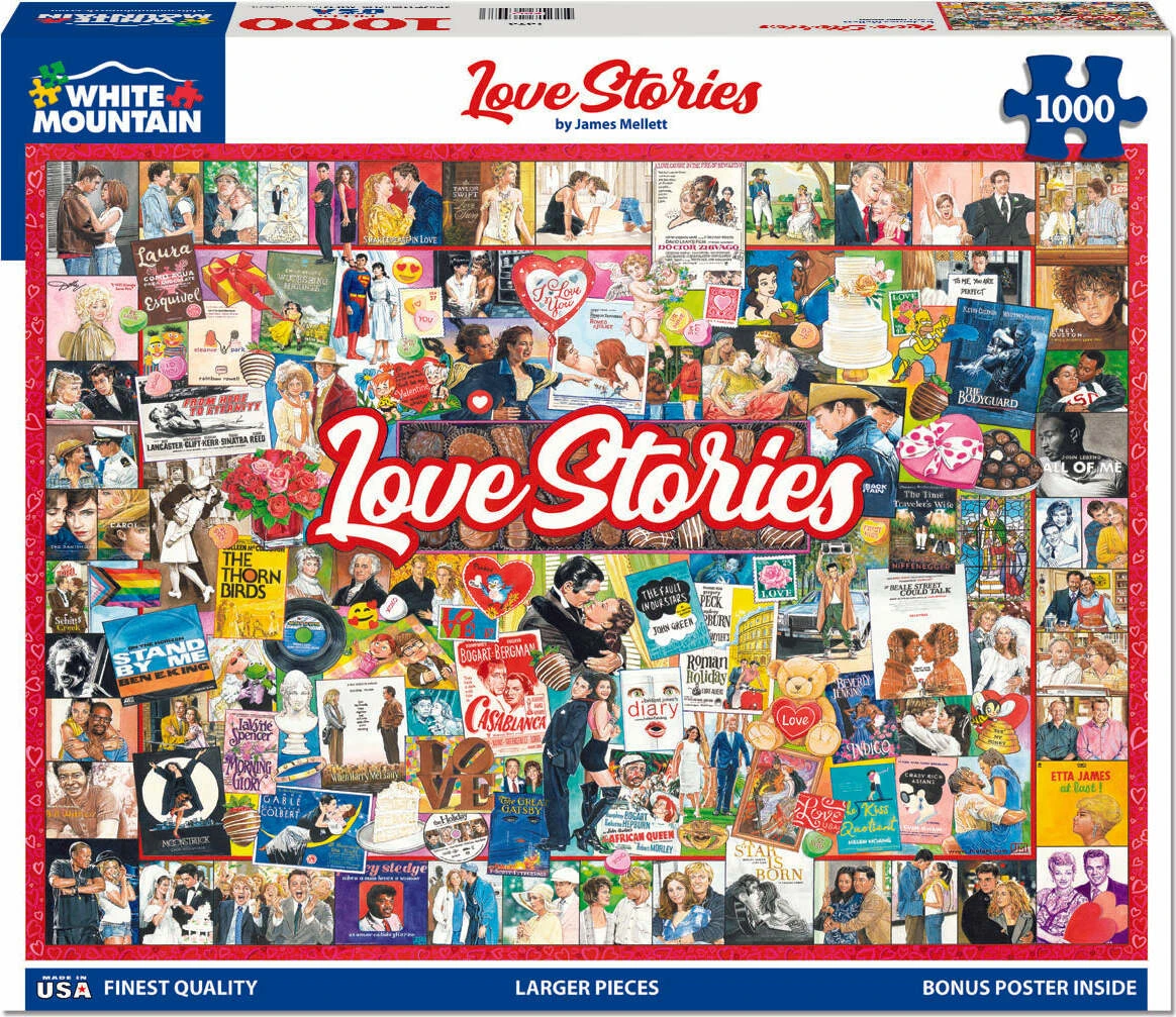1676 Love Stories. Fly with Rose, Dance to At Last by Etta James, and Say Anything with John Cusack. Relive moments that can never be lost in history – both funny and classic memories brought to life in pictures, film, television, and music. Artist James Mellett gathered Love Stories from the past and present in this collage style1000 piece. Jigsaw puzzle. Finished size of 24″ x 30″.