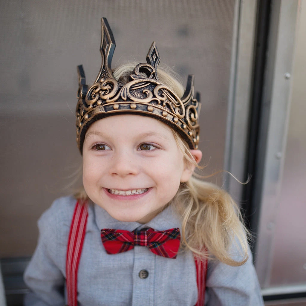 Be the king or queen of the castle with this gold medieval crown. Accented with black, this crown is made from a flexible rubberized/coated EVA foam for extra comfort. These crowns are durable and excellent quality! Size flexible from kids to adults with sewn in Velcro.