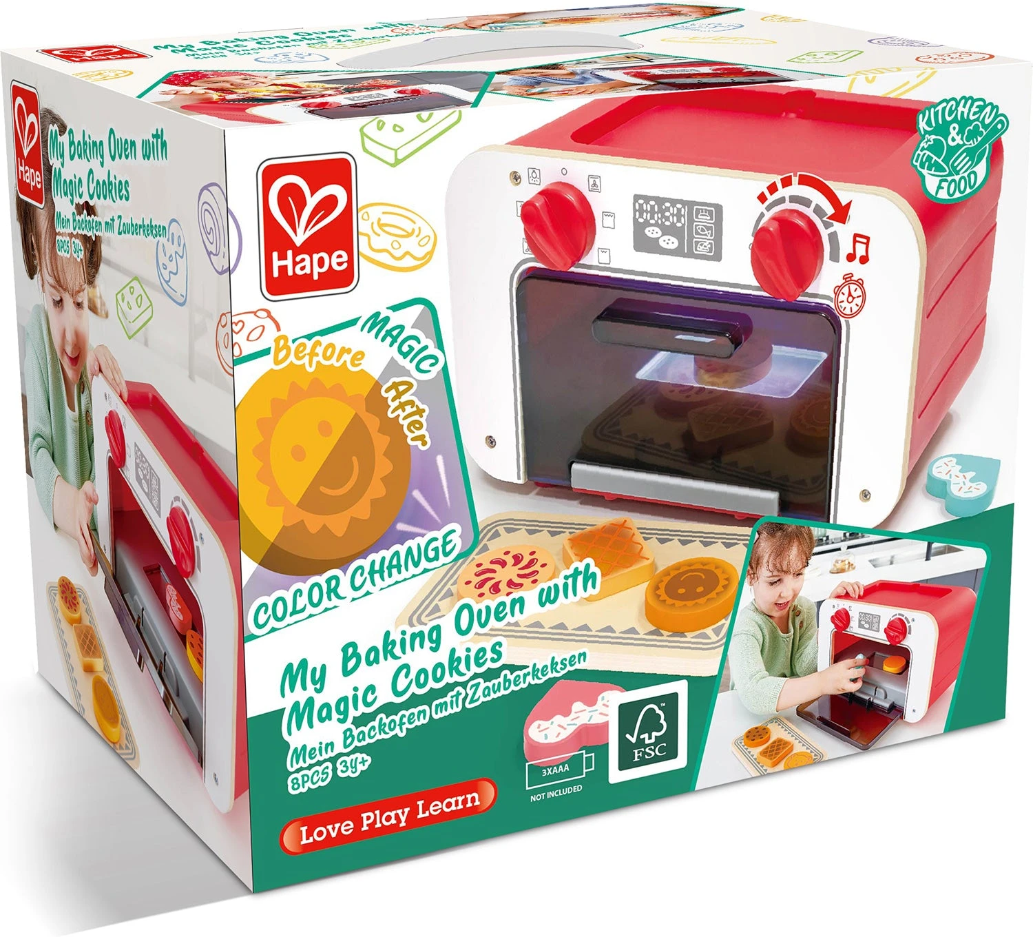 Young bakers in training can cook up delicious pretend play pastries with this beautiful set! Mirroring parents’ behavior, little learners add wooden cookies to the oven. Turn the dial and wait for the timer to count down – after the ding, open up the oven to see that the cookies have magically changed color! Includes 6 cookies, oven, and tray that doubles as an imaginary cooktop. Requires 3 AAA batteries, not included.