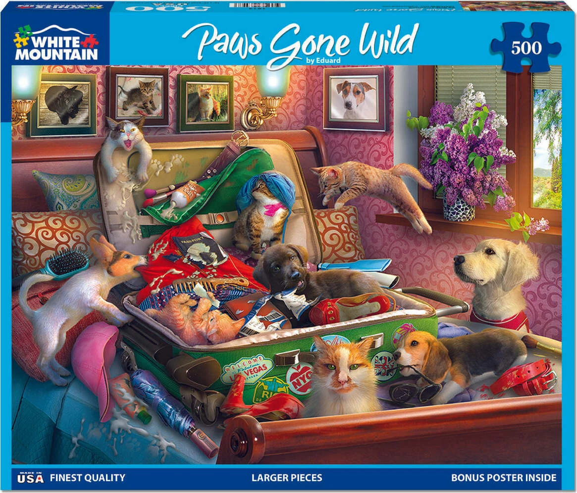 1851pz Paws Gone Wild. What happens when puppies and kittens are left unsupervised? Not vacation, that’s for sure. Artist Edward reminds you not to walk away from your luggage when pets are present. 500 piece jigsaw puzzle with a finished size of 18″ x 24″.