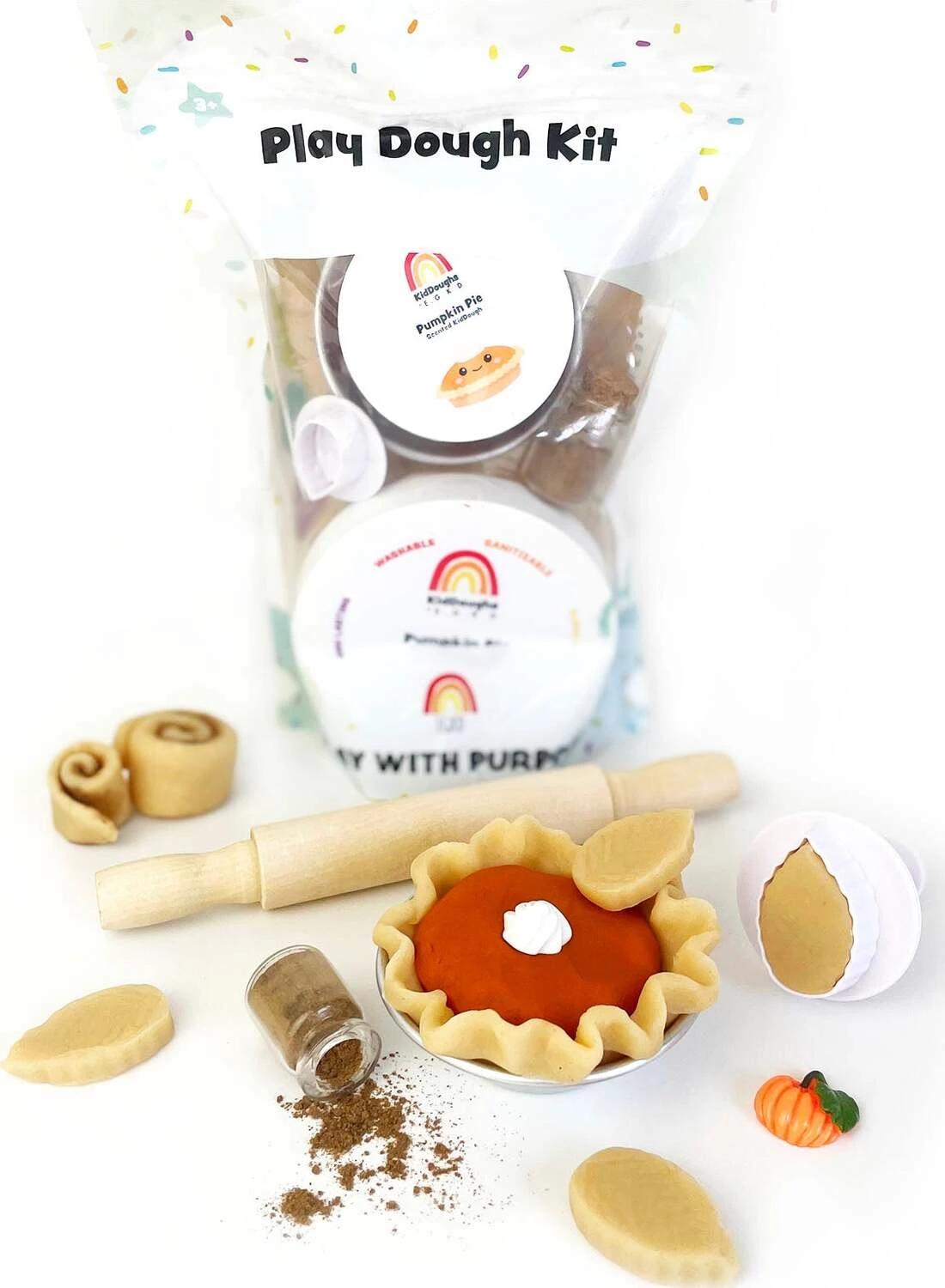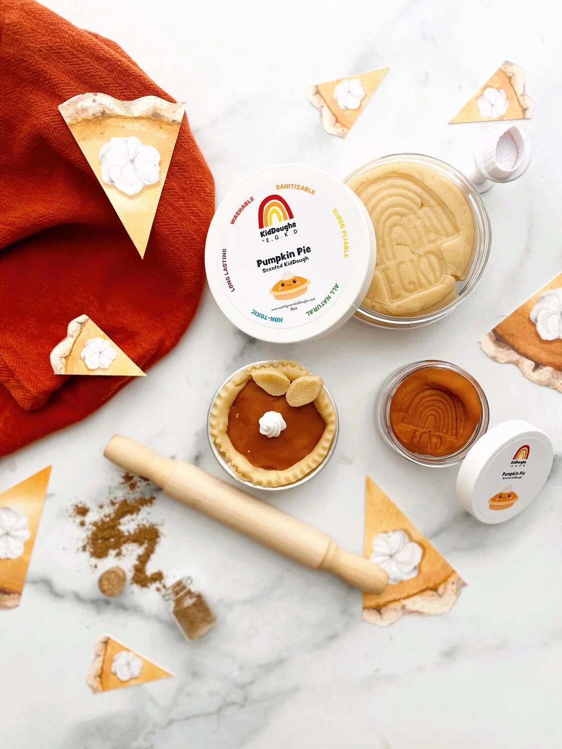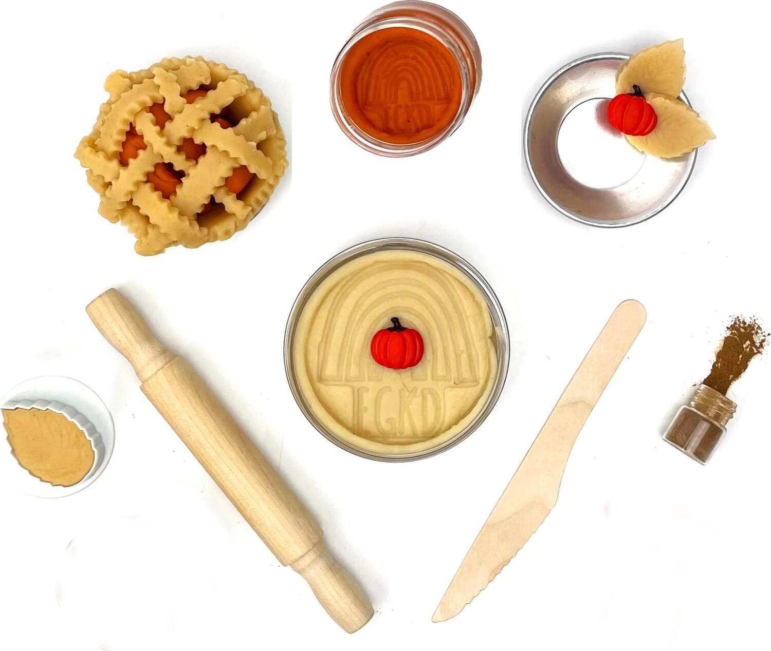 This Pumpkin Pie Play Kit includes a half pound jar of Pie Crust KidDough with charm, a 2 ounce mini jar of KidDough “filling” (orange/pumpkin), wood rolling pin, wood rolling wavy pie cutter, jar of spices, decorative leaf plunger, apple form, and wood knife.
