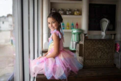 Get ready for sparkly, imaginative fun with this shimmering, pretty set! Rainbow sequin detailing with a comfortable elastic waistband, stretchy straps with organza capped sleeves, plus matching wings made of rainbow mesh fabric will provide your little fairy with hours of magical play. It’s glitter free, too, and of course, machine washable. Size 5-6.