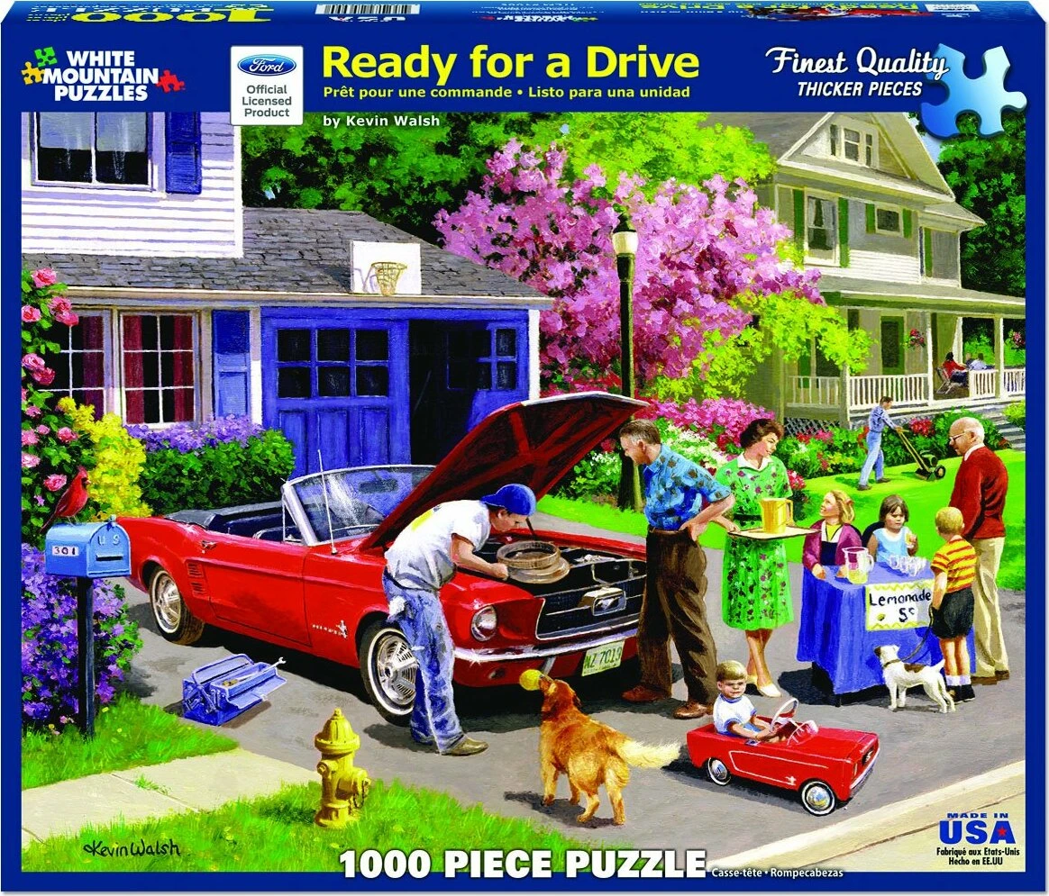 Ready for a Drive, 1000 piece puzzle. British artist Kevin Walsh has painted this view of pure Americana. On a leafy suburban street Mom replenishes the kid’s lemonade stand as Junior & Dad restore a classic Mustang convertible in this puzzle the whole family’s sure to love. Dogs and a lawnmower provide the background chorus. 1000 piece puzzle.