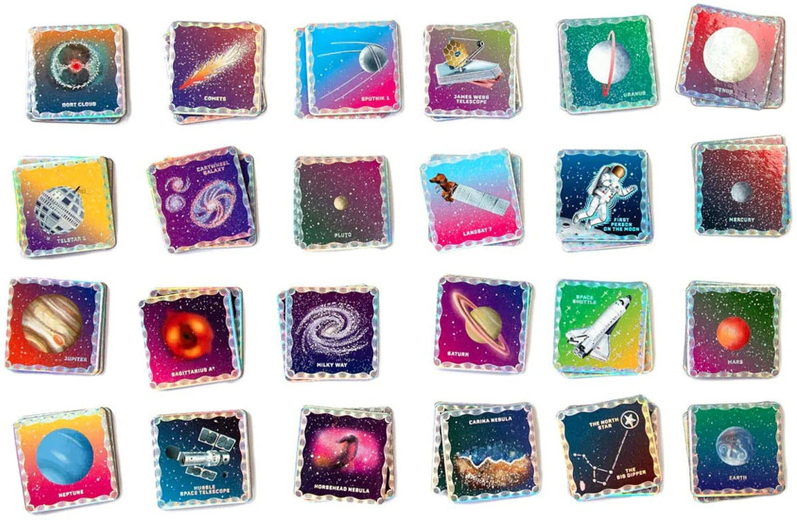 Introduce your little star to the wonders of our solar system! This dazzling memory and matching game has thick cardboard tiles that are easy for little hands to turn over and hold. Kids practice recognition, concentration, and learn planet names as they try to collect the most pairs to win! Each set contains 24 matching 2.25″ by 2.25″ pairs finished with shiny metallic foil. We love that it’s made with recycled board using vegetable-based inks. For 1-6 players.