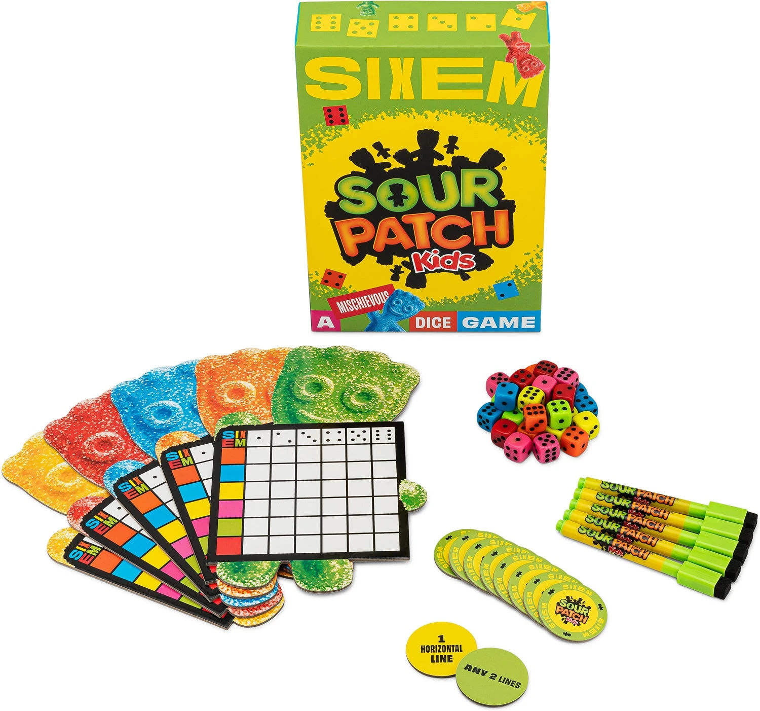 Roll FAST to beat family and friends in this mischievous Sour Patch Kids dice game that’s perfect for parties and game nights! Each player gets a set of 6 colorful dice, a dry erase marker, and gameboard. Flip a pattern token to determine the pattern you’re trying to complete with your dice, then let the fast rolling frenzy begin! Pick your dice to win, play sour to sabotage and remove X’s from your opponents’ boards, or play sweet to give X’s to others. The first player to match the pattern with six X’s in a row wins! Includes 10 pattern tokens, 5 player boards, 5 dry erase markers, 30 colorful dice, and 1 set of rules. For 2-5 players.