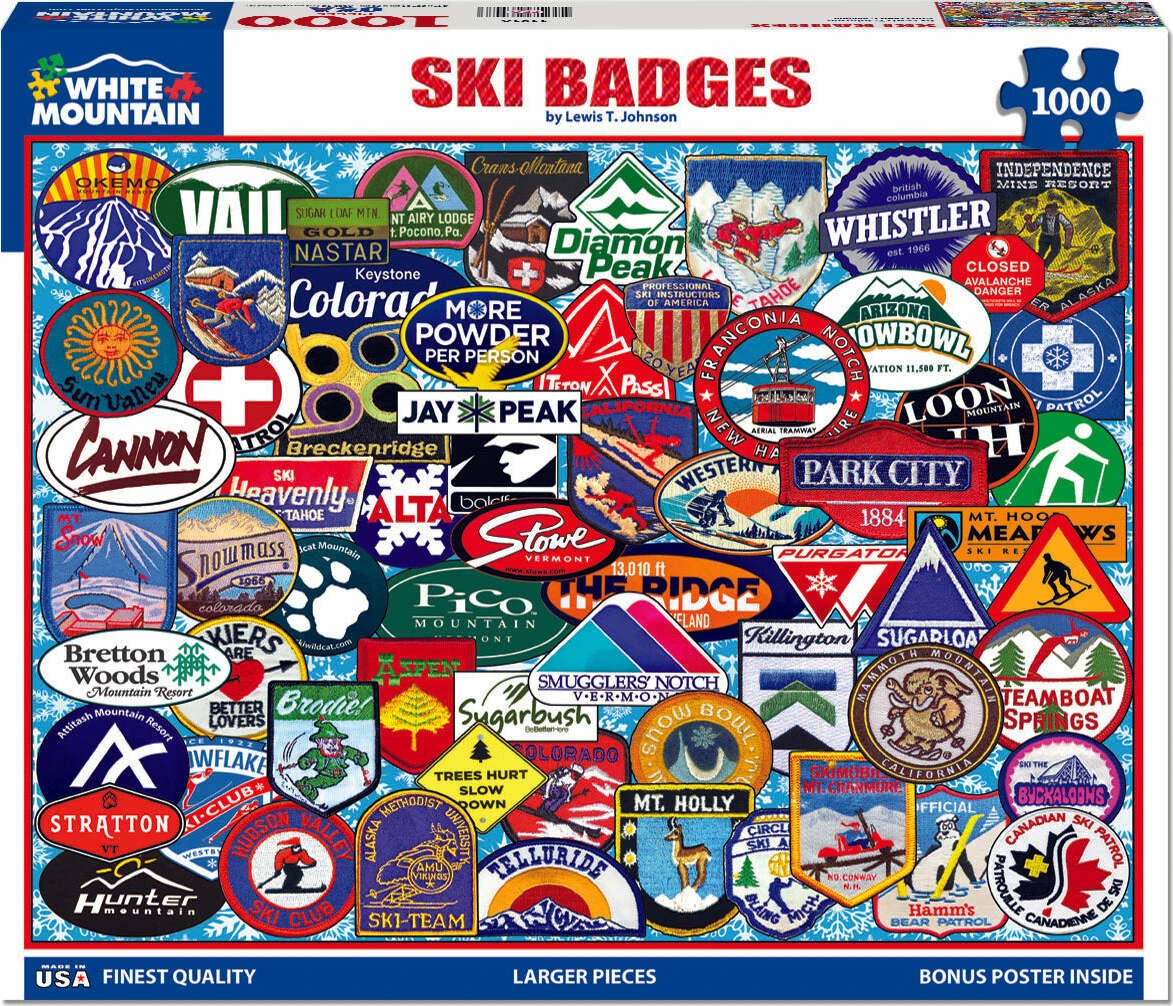 Ski Badges. Picture this puzzle completed, framed and hanging on the wall of your mountainside chalet! Ski areas from all over the country are represented in this collection by Lewis T. Johnson, but we have to start with New Hampshire’s own Attitash, Cranmore, Wildcat, Bretton Woods, Cannon and Loon. Our New England neighbors Okemo, Stratton, Sugarbush, Smuggler’s Notch, Pico, Stowe, Killington, Sugarloaf, Jay Peak, Brodie and Hunter are included, and further afield are Steamboat Springs, Telluride, Snowmass, Heavenly, Park City, Purgatory, Whistler, Keystone, Vail and many more. 1,000 piece puzzle. Finished size 24″ x 30″.
