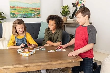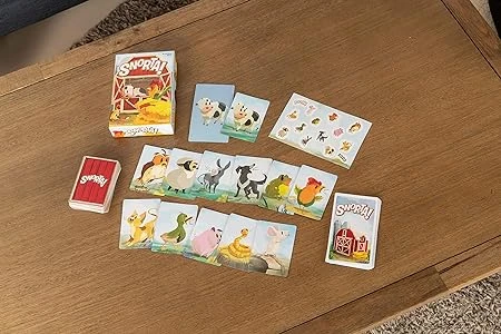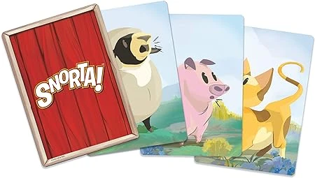 In Snorta!, each player is given a barn tile with their secret animal on it and a hand of animal cards. When a card placed down matches one of the cards already on the table, those two players rush to say the animal sound of the other player, not the sound of the animal on the card. If you say the other player’s sound first, you give them all the cards you’ve flipped onto the table in front of you. The first person to get all the cards out of their hand is the winner!