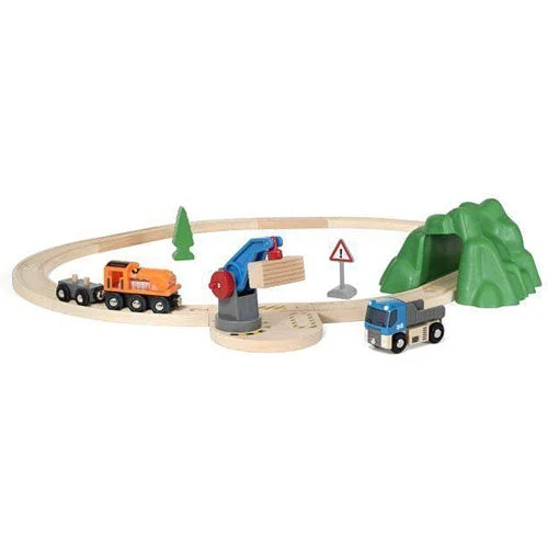 All aboard! Build your first BRIO World with this new lift and load starter set. The layout is packed with machine toys – grab crane, truck, a pop-up hood engine and wagon with load – even a warning sign, spruce and a small mountain to thunder through! Lift the cargo off the truck toy with the crane, turn and load onto the train. Works great with all products within BRIO World.