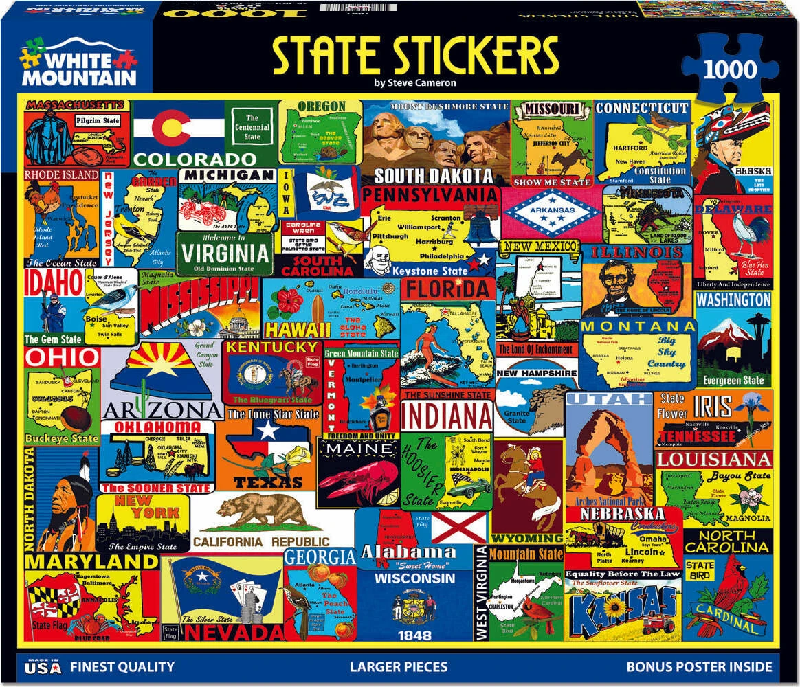 1661 State Stickers. Travel the United States with us. Do you know what each state is known for? From flags to slogans to state birds, this puzzle is both fun and a test of knowledge. Designer Steve Cameron has assembled this colorful collage to test your wit and take you on a road trip from your living room. State Stickers is a 1,000 piece puzzle with a finished size of 24″ x 30″.