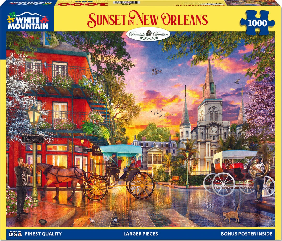 1782pz Sunset in New Orleans. The sun is setting on the mighty Mississippi, casting hues of lavender, orange, and yellow accented by migrating geese off in the distance. After a rain shower, Decatur Street is clean and smells fresh and new. Couples take a carriage ride through the historic French Quarter while others stand and listen to the buskers as they perform classical jazz. Artist Dominic Davison provides White Mountain Puzzles a with a small glimpse of history in this 1000 piece jigsaw puzzle. Finished size 24″ x 30″.