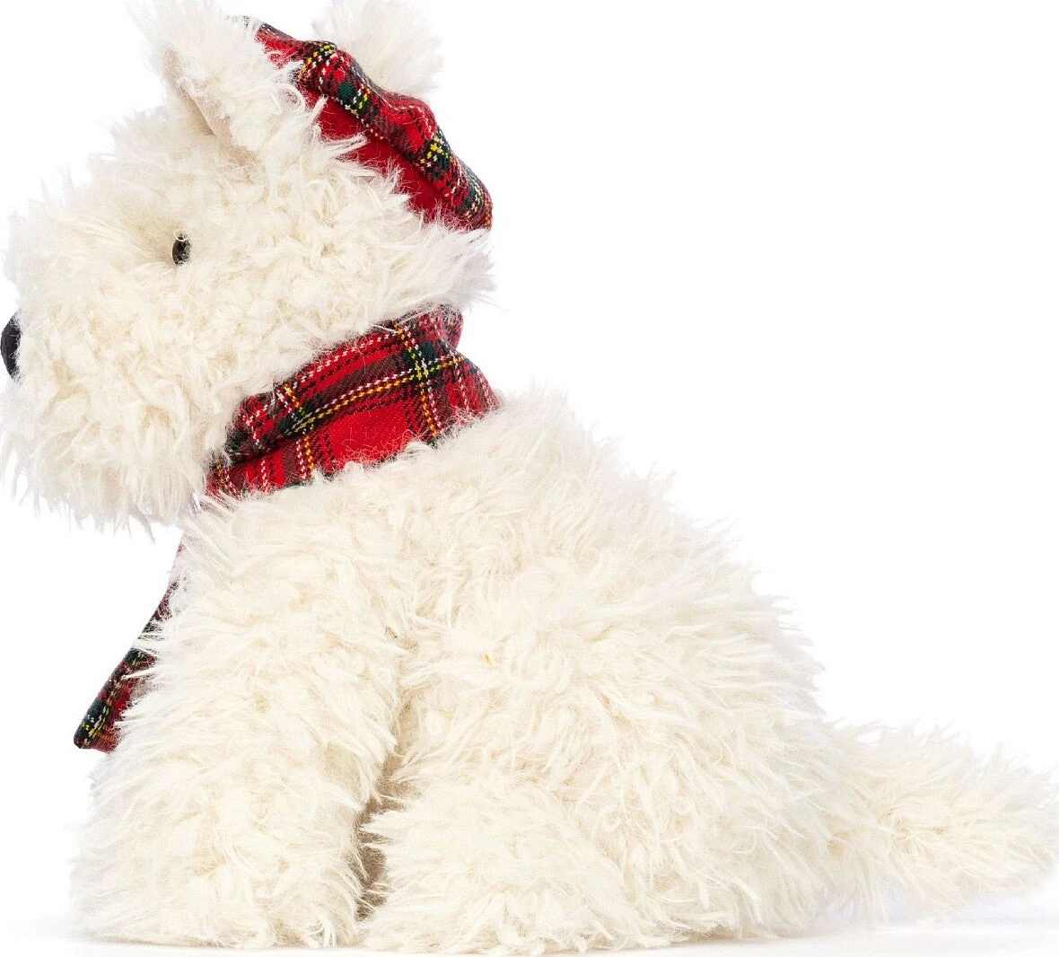 Winter Warmer Munro Scottie Dog is snuggled up against the cold! Wearing a red tartan tam o’ shanter and matching crossover scarf, this wee dog is plenty cosy! With gorgeously shaggy porridge fur, a black nose and pink inner ear, Munro is the pup for toasty cuddles.